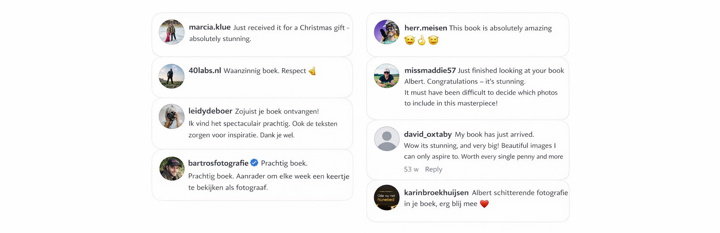 Albert’s photography style definitely involves postprocessing and sometimes complex techniques. Processing techniques involve working on colour and contrast. Moments are never altered: all moments are completely real: from the aurora above the windmills, the spectacular tulip lightning strikes, and all other spectacular moments in the book. Albert is extremely persistent, and spends a lot of time and effort to get the perfect shots in the field.