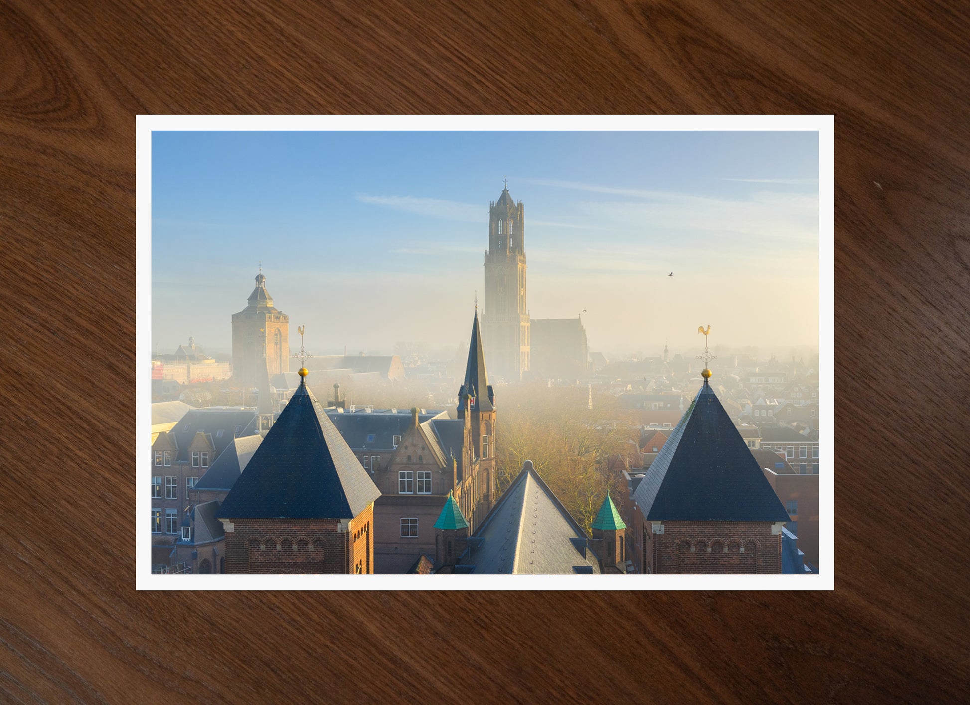 Een originele compositie van de Domtoren met tal van andere torens op de foto. Een interessante mix van architectuur uit verschillende tijdperken.